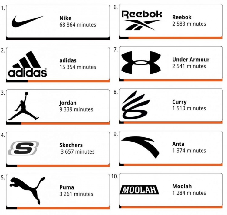 品牌方面,Nike以68864分钟的总时长稳居第一,而在前十名中也有中国运动品牌亮相。